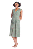 Featuring a vintage effect viscose material, this slightly longer length dress with its flattering button up bodice and cinching waist belt can be easily worn as a casual day dress with some sweet tennis shoes, or jazzed up to great effect with the addition of some heels, seamed stockings, and one of our velvet clutch bags.