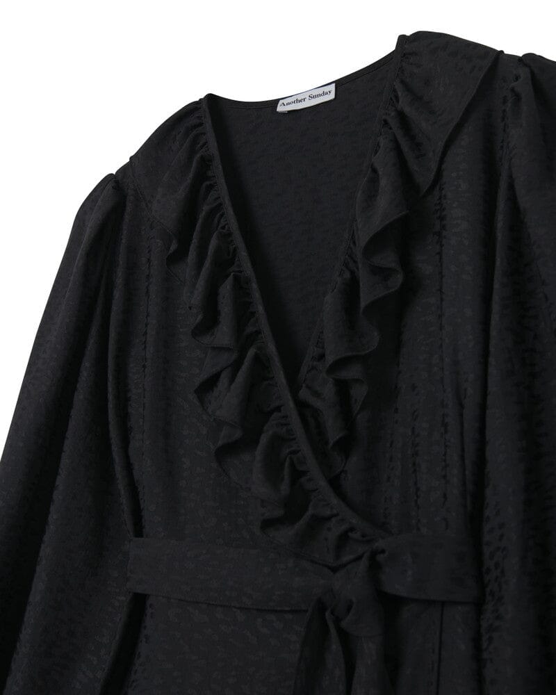 The subtle leopard print jacquard fabric gives a unique edge, while the adjustable wrap and ruffle detail at the neckline enhance the elegant shape. The unlined material allows for a beautiful drape.
