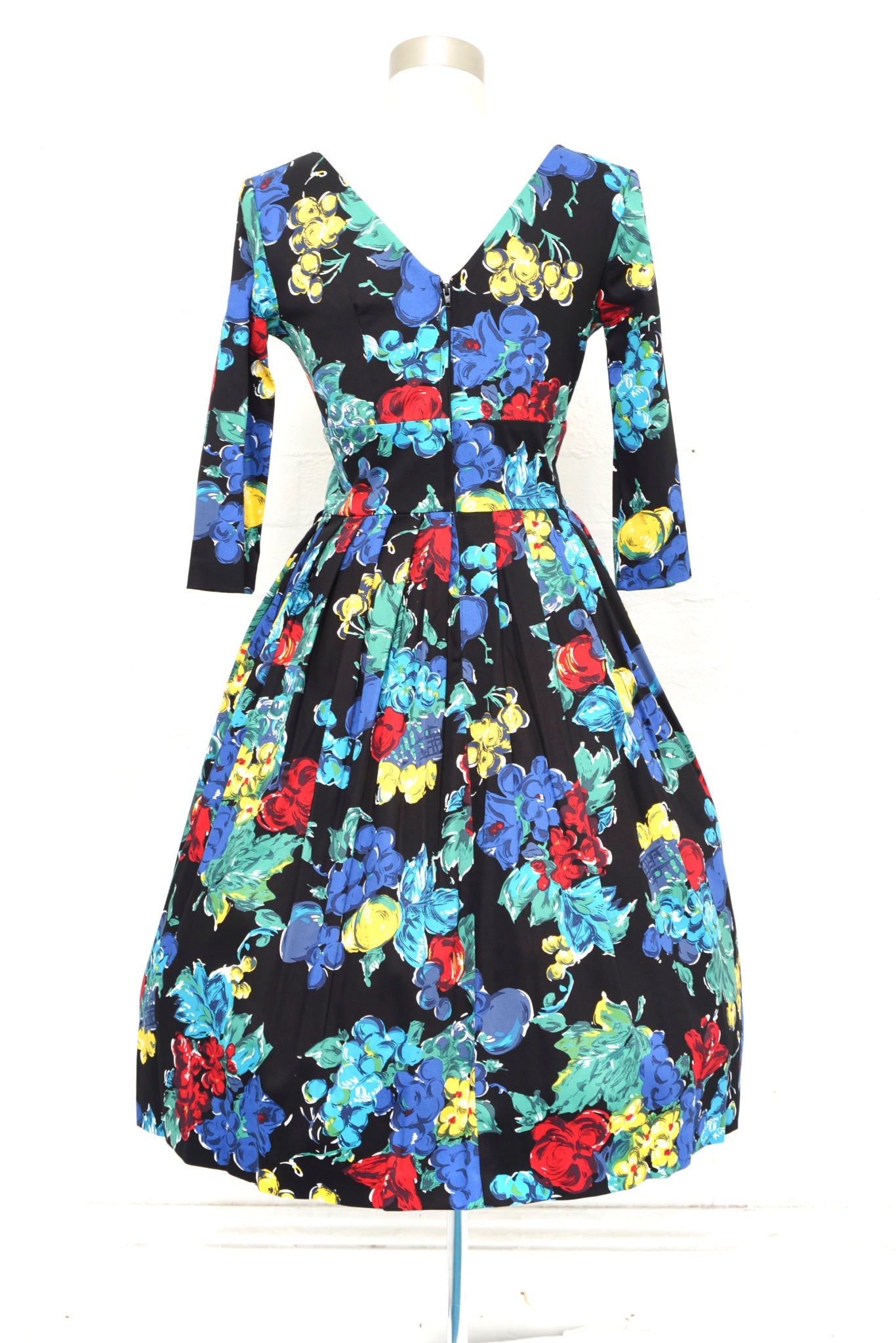 The fabric on this dress will stretch about 1" so if you are between sizes, we recommend sizing down for a pin up fit.