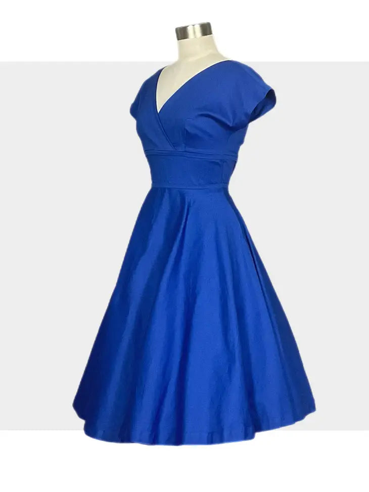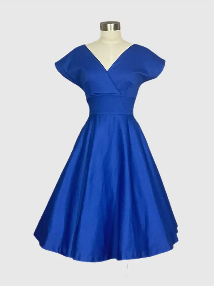 A beautifully shaped dress in a stunning block colour, tailored to perfection with dolman sleeves, full circle skirt (great with or without a petticoat!) and a special bias tuck detail each side of the waist to add instant emphasis to the shape.