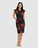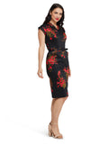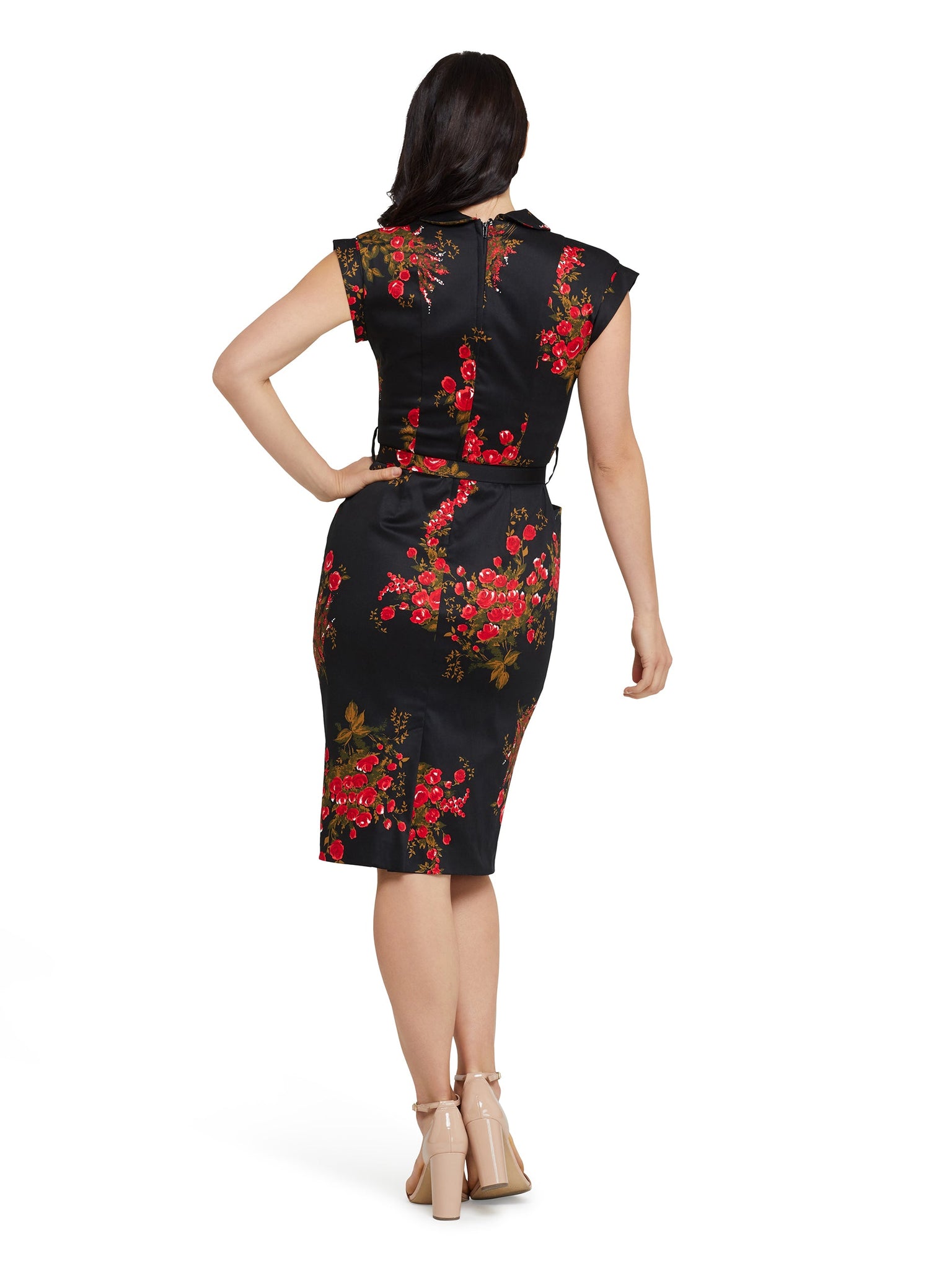 The fabric on this dress will stretch about 1" so if you are between sizes, we recommend sizing down for a pin up fit.