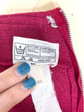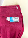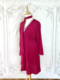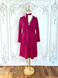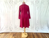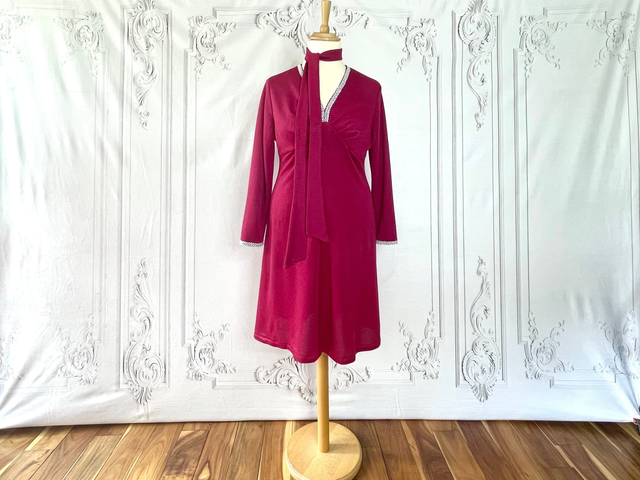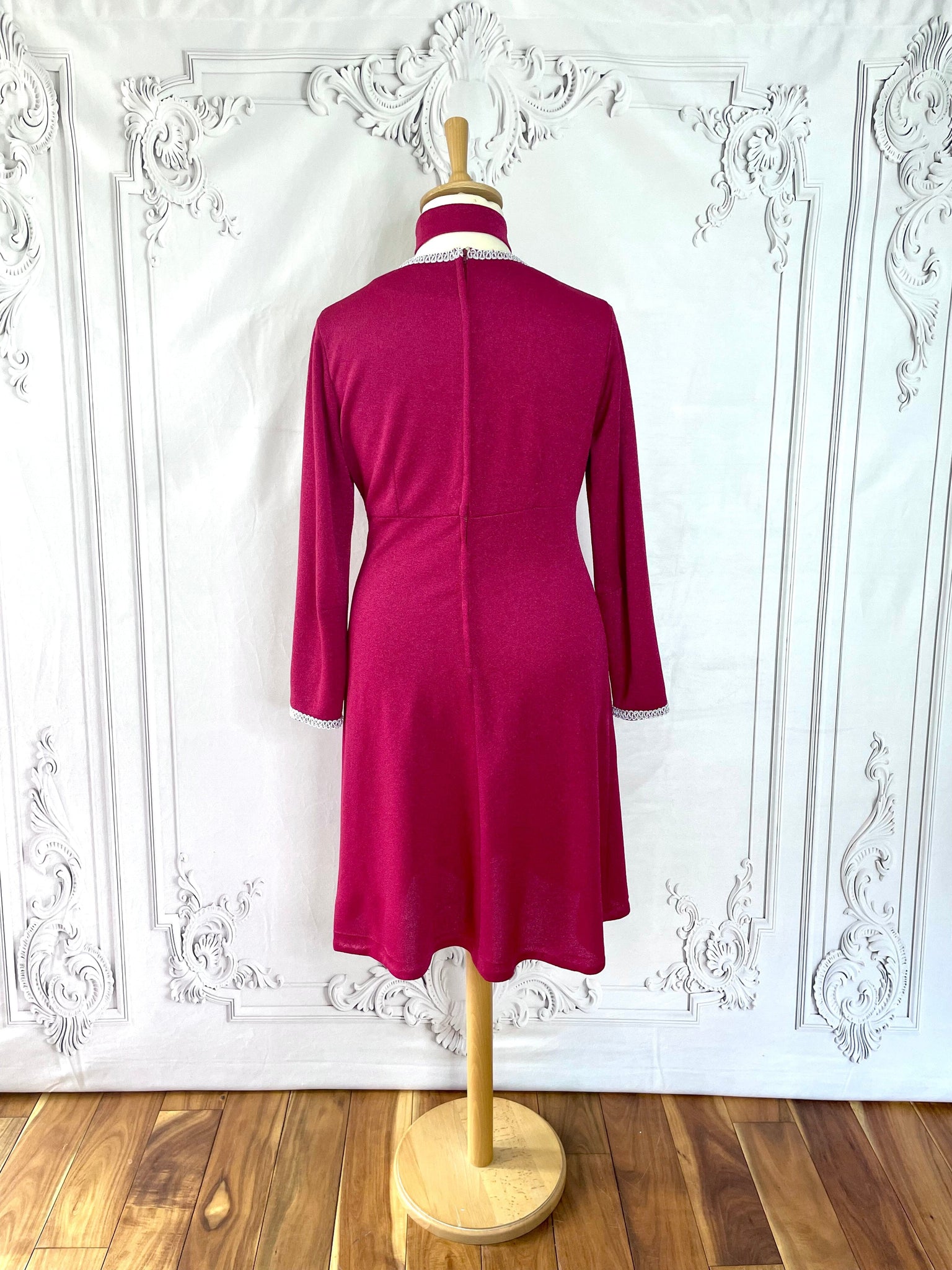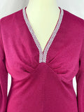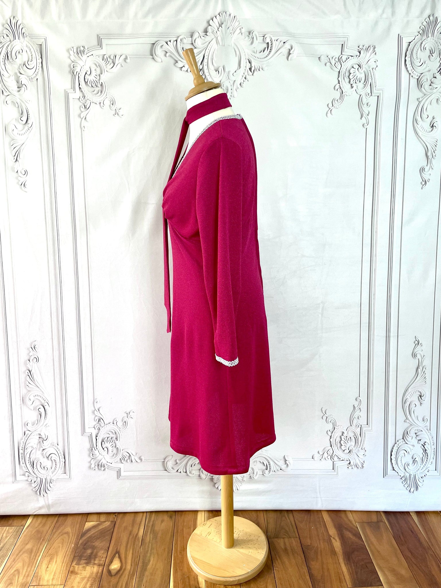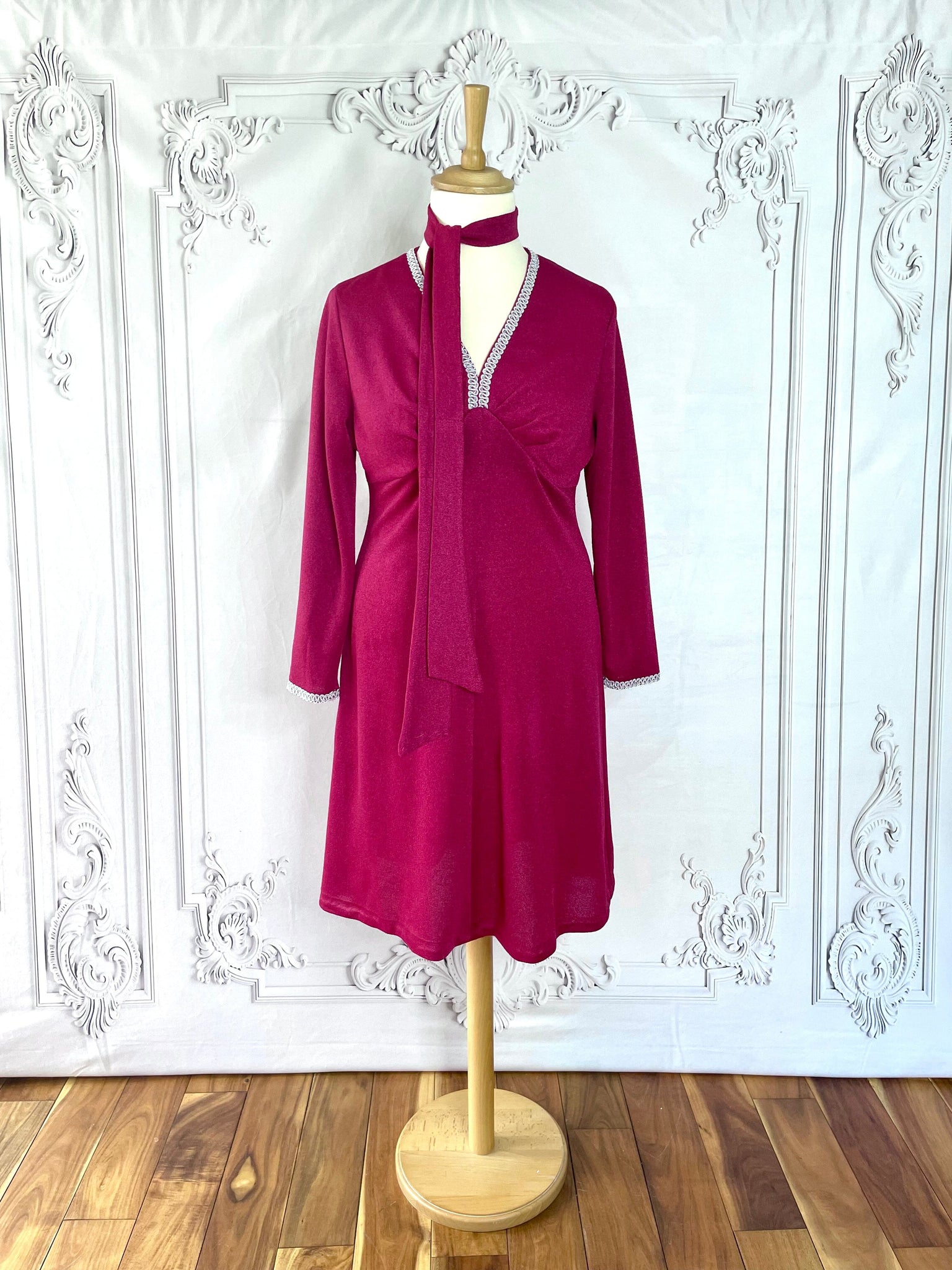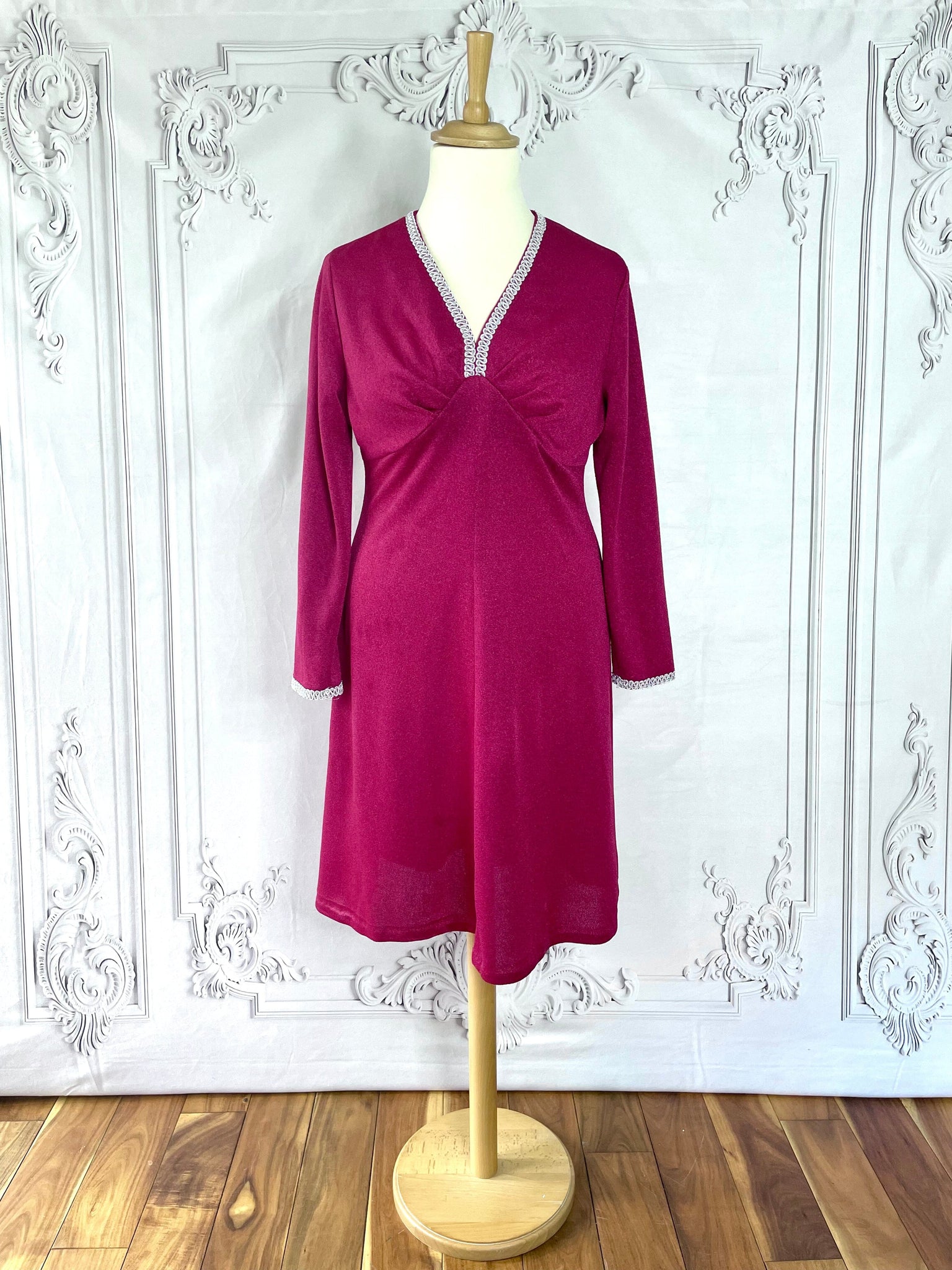 This darling mini dress is a must-have from the 1960s mod era. Boasting a deep magenta hue with a subtle sparkle and stretchiness, it's sure to flatter with its empire line shape. An A-line silhouette skims curves, while a sparkly silver-braided V neckline adds an extra touch of glam that is mirrored on the cuff of the sleeves. With a back metal zipper closure and a coordinating tie, you can pull off a scooter girl look with ease.
