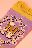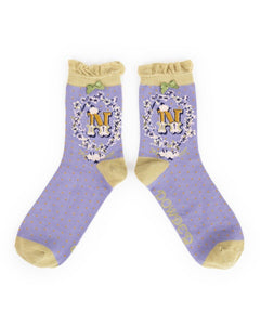 These gorgeous ankle socks have a beautifully illustrated initial surrounded by flowers and polka dots in the most eye catching colours going and a delicate ribbon at the top. Idea to show off with calf-length trousers or a shorter skirt or just enjoy the fun flash of colour at your ankle hem!