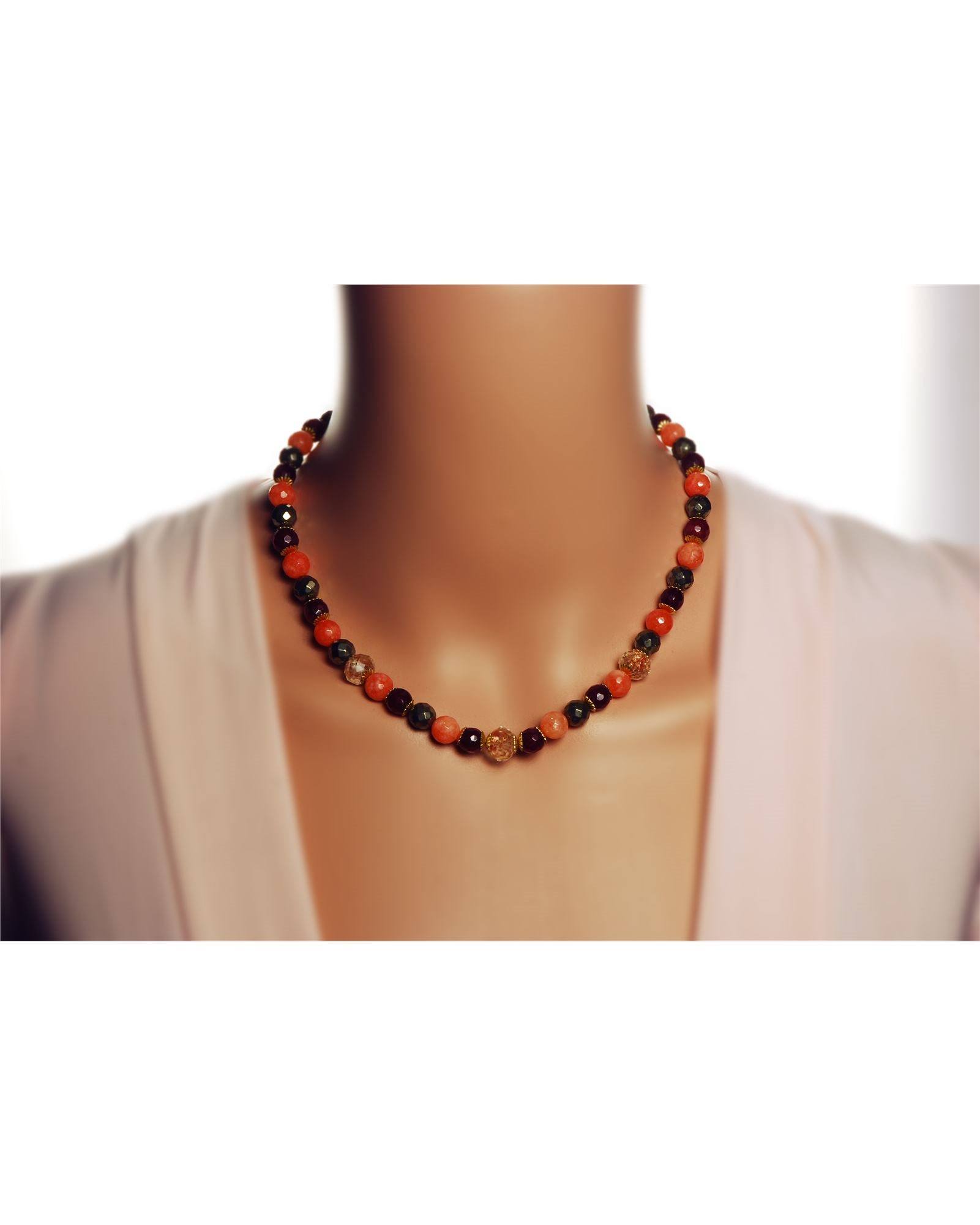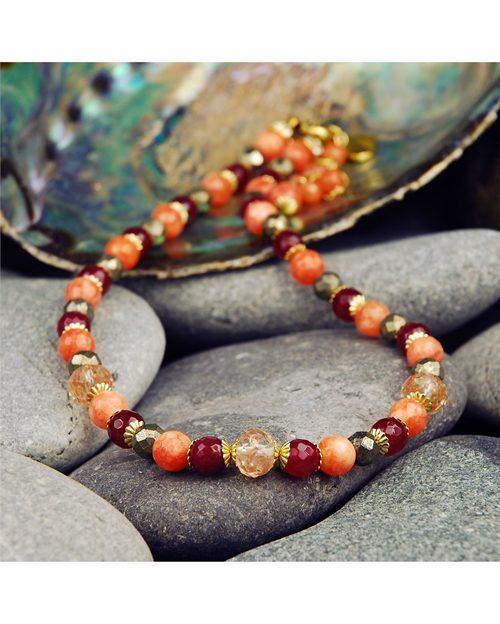 Gloriously golden and reminiscent of a thousand sunsets, this beautiful hand-made necklace has stunning, natural beads of Coral, Agate and Sandstone, complemented by handmade glass beads with embellishments. Perfect to wear during the day, but easily takes you into the evening. It will enchant you at every wear! Fastens with a magnetic clasp, and has a flattering drop.