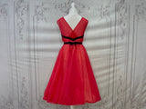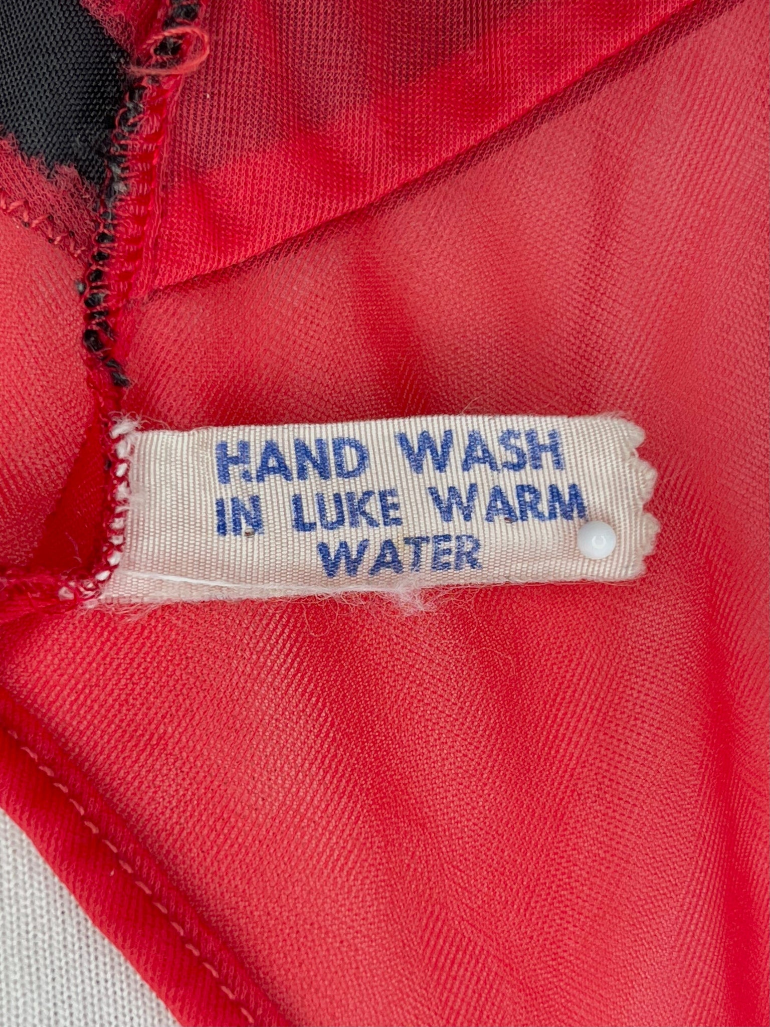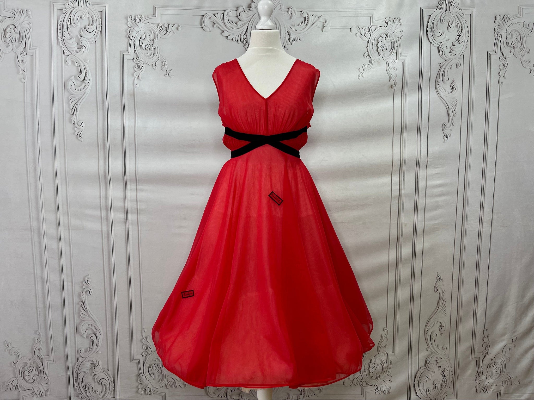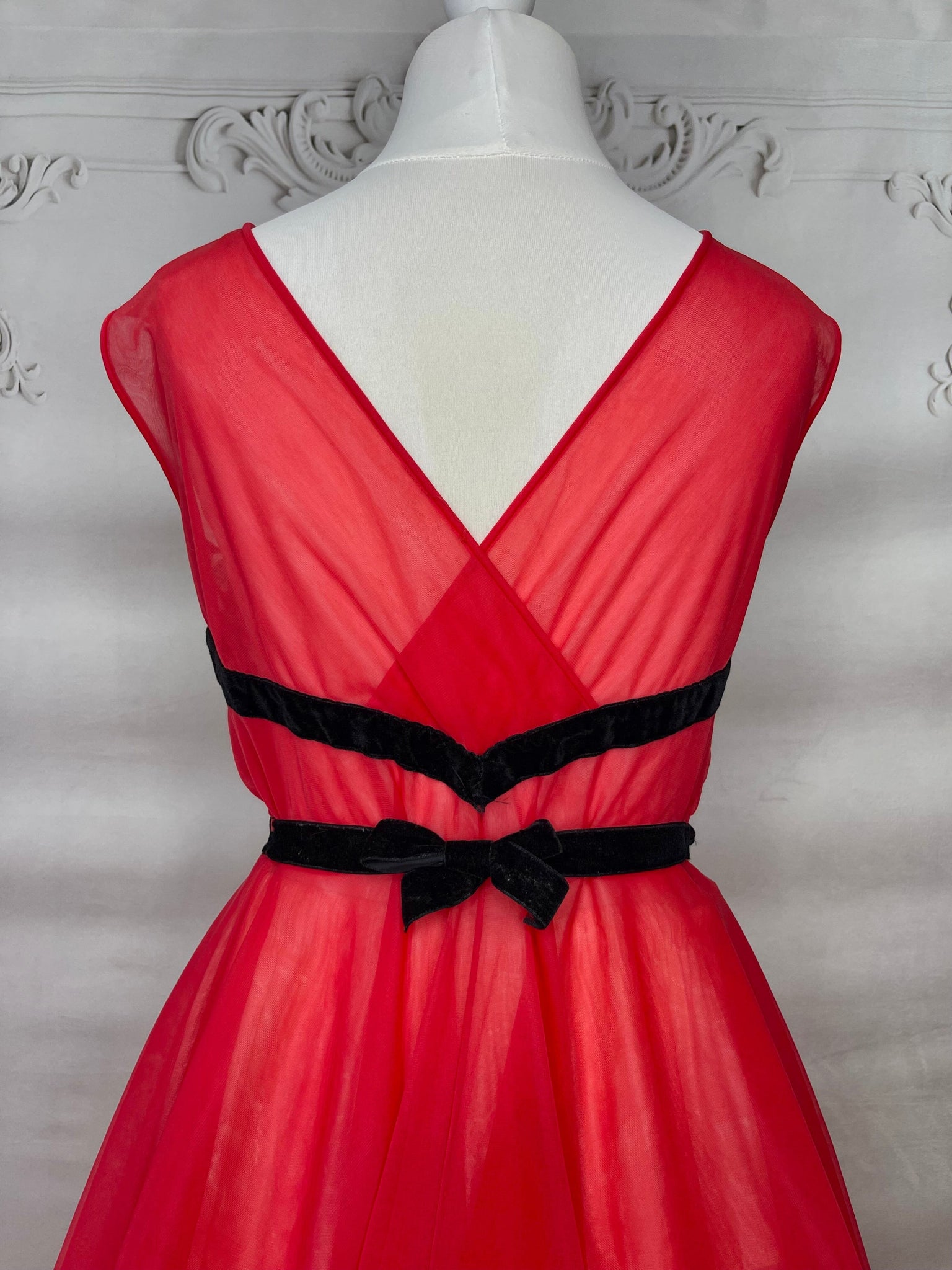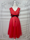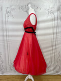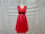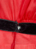 This is a rare find - a fabulous diaphanous chiffon negligee from very late 1950s-early 1960s. A darling little number in a sheer true red with black velvet ribbon and embroidery detailing, and ruched side panels between the ribbon.  Also features some darling novelty applique "stamps" to the front of the skirt that read "Monte Carlo" and "Las Vegas". Perhaps a special treasure from a gals honeymoon trousseau? A plunging neckline and a darling cross over back detail make this a very risque piece for its time!