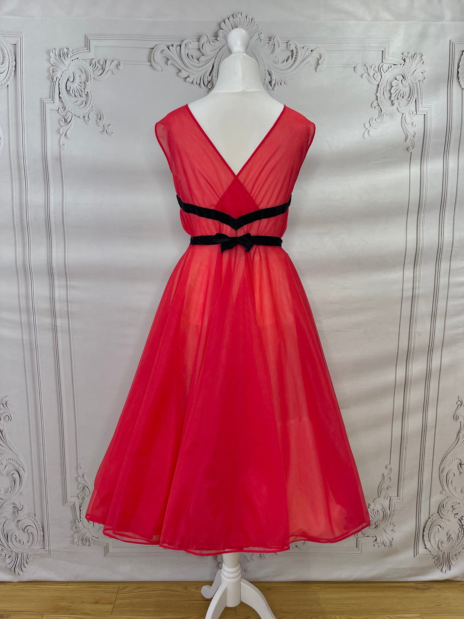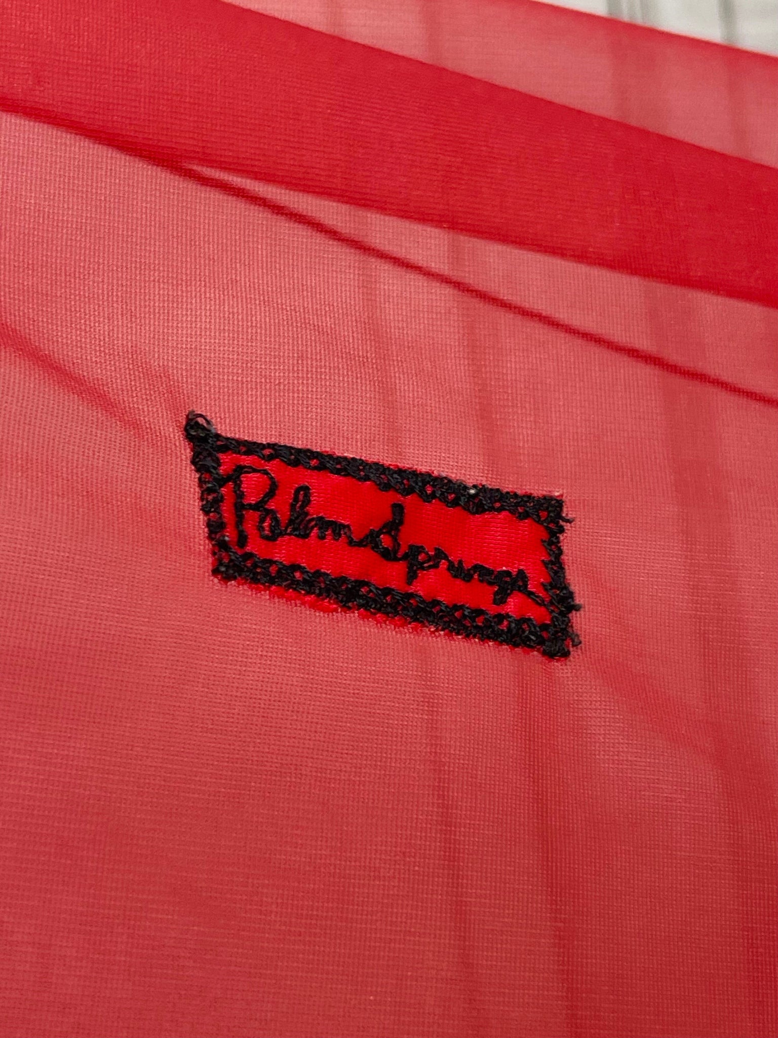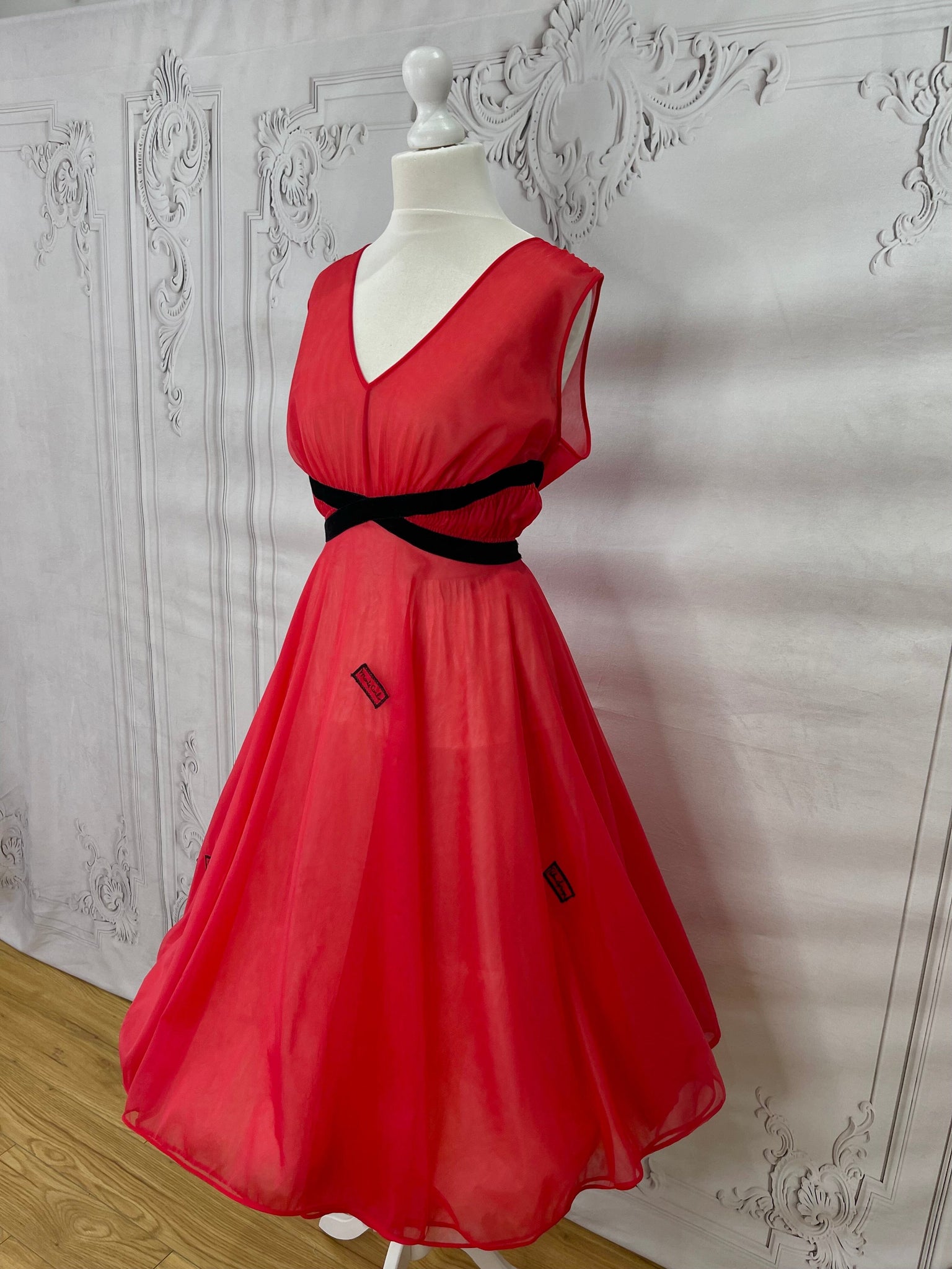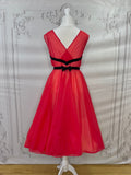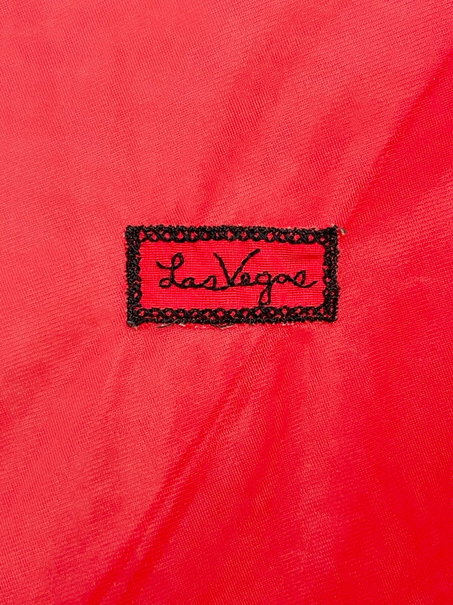 This is a rare find - a fabulous diaphanous chiffon negligee from very late 1950s-early 1960s. A darling little number in a sheer true red with black velvet ribbon and embroidery detailing, and ruched side panels between the ribbon.  Also features some darling novelty applique "stamps" to the front of the skirt that read "Monte Carlo" and "Las Vegas". Perhaps a special treasure from a gals honeymoon trousseau? A plunging neckline and a darling cross over back detail make this a very risque piece for its time!